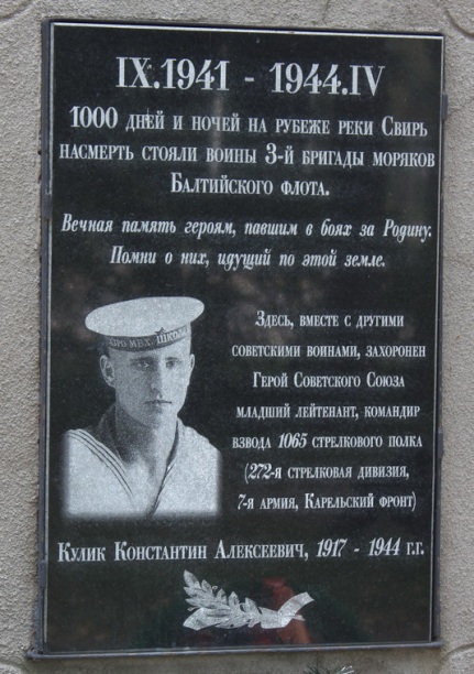 Командир взвода 1065-го стрелкового полка (272-я стрелковая дивизия, 7-я армия, Карельский фронт) комсомолец младший лейтенант Константин Кулик 21 июня 1944 года со взводом форсировал реку Свирь у города Лодейное Поле Ленинградской области, обеспечил переправу подразделений полка.
