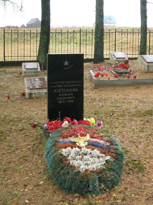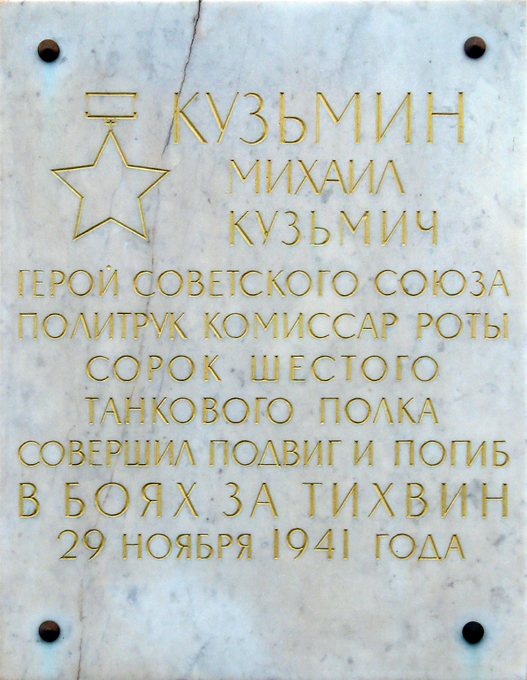 Политрук танковой роты 46-го танкового полка 46-й танковой бригады 4-й отдельной армии политрук М.К. Кузьмин совершил выдающийся подвиг в ходе Тихвинской наступательной операции. 29 ноября 1941 года во время атаки вражеских позиций в районе Кордон Спасский (Тихвинский район Ленинградской обл.) политрук Кузьмин находился в танке головном танке КВ-2. Прямым попаданием снаряда танк был подбит, весь экипаж, кроме Кузьмина, исполнявшего обязанности артиллериста, погиб. Политрук продолжал вести огонь по окружившим его фашистам из зенитного пулемета, отбивался гранатами, отстреливался до последнего патрона. Он предпочел сгореть в танке, но не попасть в руки врага.