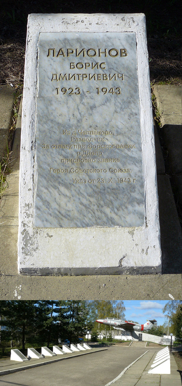 * Дата смерти и боя, за который Ларионов был представлен к высокому званию, в краеведческой литературе приводятся другие. Форсирование реки - 24 сентября, разведвыход, в котором был захвачен штаб немецкого батальона и 11 (а не 4) пленных, - 26 сентября. Погиб в бою 28 сентября.