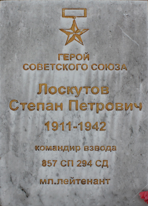 Командир стрелкового взвода 857-го стрелкового полка (294-я стрелковая дивизия, 8-я армия, Ленинградский фронт) комсомолец старший сержант Степан Лоскутов в боях на Ленинградском фронте из снайперской винтовки уничтожил сто семнадцать вражеских солдат и офицеров.