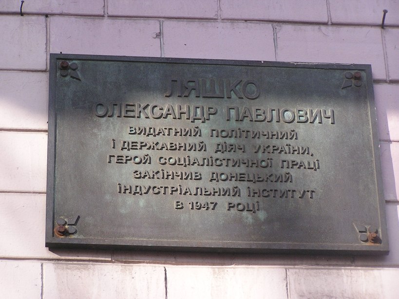 Мемориальная доска установлена на здании 1-го корпуса Донецкого индустриального института, который А.П.Ляшко окончил в 1947 году.