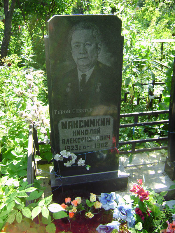 С 1946 года капитан Н.А.Максимкин в запасе. Жил в Москве. Работал в финансовом отделе на Московской железной дороге. Умер 1 января 1982 года. Похоронен в Москве на Хованском Центральном кладбище.