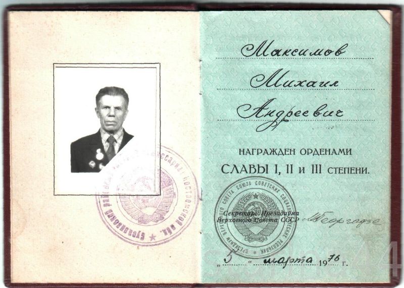 Приказом командующего 5-й гвардейской армией от 27 июля 1944 года гвардии сержант Максимов Михаил Андреевич награжден орденом Славы 2-й степени.