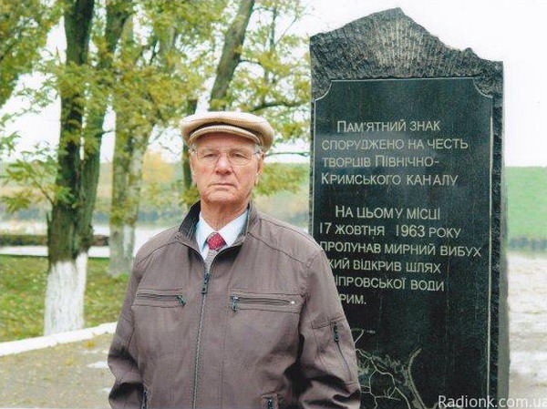 В. Н. Мартынюк у памятного знака в честь строителей Северо-Крымского канала. Фото с сайта Радио «Новая Каховка».