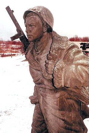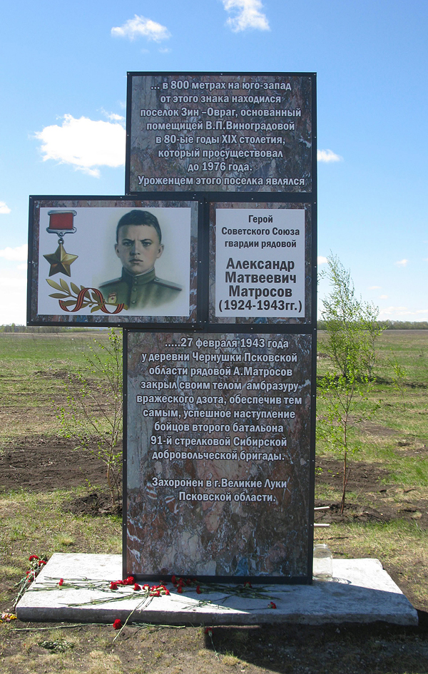 23 февраля 1943 года гвардии рядовой 254-го гвардейского стрелкового полка 56-й гвардейской стрелковой дивизии Александр Матвеевич Матросов в решающую минуту боя с немецко-фашистскими захватчиками за дер. Чернушки, прорвавшись к вражескому ДЗОТу, закрыл своим телом амбразуру, пожертвовал собой и тем обеспечил успех наступающего подразделения.
