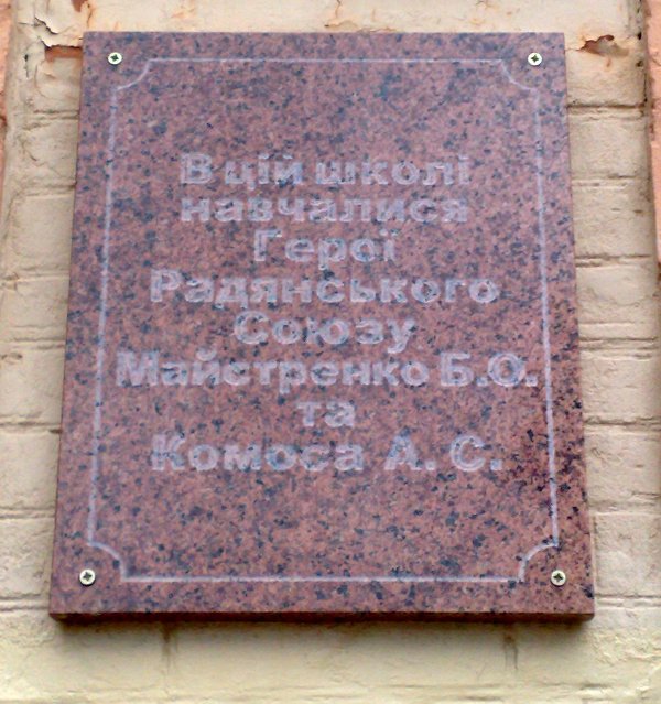 Новгород-Северская школа № 1 имени Героя Советского Союза Бориса Александровича Майстренко. При входе — портрет танкиста с юным мужественным лицом.