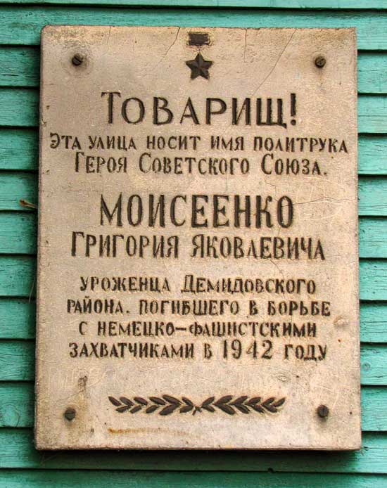 26 февраля 1942 года в ходе ожесточённого оборонительного боя в районе села Холм-Жирковский (ныне посёлок городского типа Смоленской области) комиссар 2-го стрелкового батальона политрук Григорий Моисеенко с группой бойцов и командиров попал в окружение. Во время боя был тяжело ранен, но не покинул позиции, продолжал руководить обороной. 19 советских воинов оставшихся в живых, в течение 16 часов отбивали яростные атаки гитлеровцев и стойко держались, а затем в критический момент раненный политрук Моисеенко Г.Я. повёл группу бойцов на прорыв и соединился с основными силами батальона. Но немецкая пуля сразила отважного комиссара.