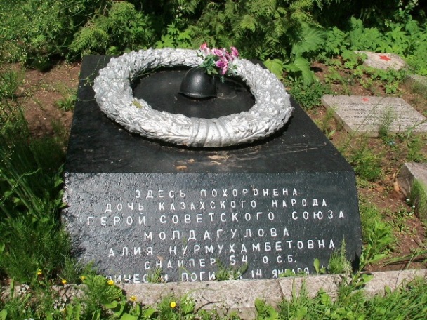 В атаку батальон пошел на рассвете. Когда до окопов осталось несколько метров, заговорил гитлеровский пулемет. Метким броском гранаты Алия заставила его умолкнуть. Первая линия вражеских укреплений была занята. За день батальон отразил две контратаки, а утром следующего дня снова пошел в наступление. Лежа в снегу, Молдагулова хладнокровно и точно вела по врагу снайперский огонь. Третий день наступления. Алия с автоматом - пуля разбила оптический прицел ее винтовки. Осколком мины она ранена в руку, но остается в строю. Гитлеровцы контратакуют. Из-за угла траншеи фашистский офицер стреляет в грудь Алии. Последним усилием она отвечает ему метким выстрелом. Это было 14 января 1944 года...