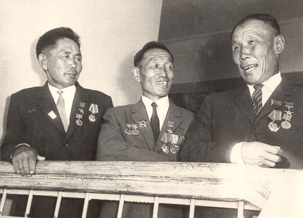 Ч.Д.Монгуш (справа) и Герой Советского Союза Ч.Хомушку (в центре) на профсоюзной конференции 1972г.