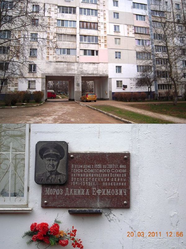 Имя Героя носит школа №1 в селе Бубновщина. В Севастополе на доме, в котором жил Д.Е.Мороз, установлена мемориальная доска.