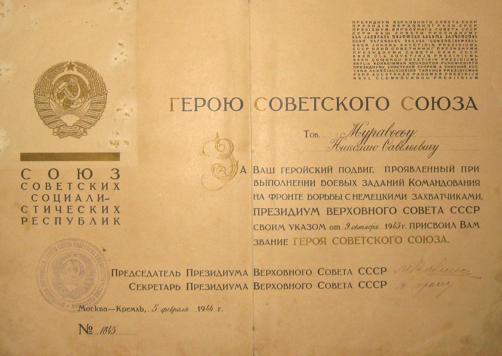 Муравьёв Николай Савельевич - командир отделения разведки 111-го гвардейского гаубичного артиллерийского полка Резерва Главного Командования 40-й армии Воронежского фронта, гвардии старший сержант.