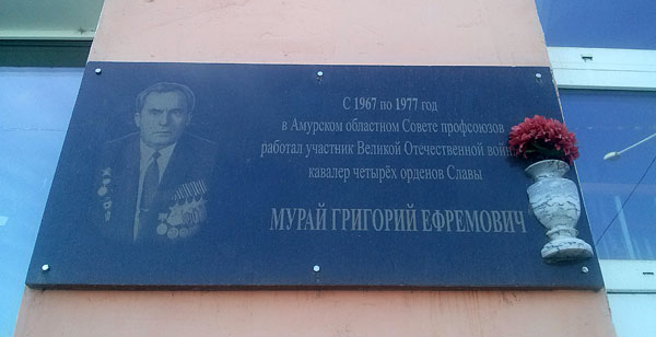 В городе Благовещенск на задние Амурской областной федерации профсоюзов установлена мемориальная доска.