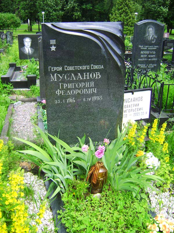 Указом Президиума Верховного Совета СССР от 24 марта 1945 года за образцовое выполнение боевых заданий командования на фронте борьбы с немецко-фашистским захватчиками и проявленные при этом мужество и героизм подполковнику Мусланову Григорию Фёдоровичу присвоено звание Героя Советского Союза с вручением ордена Ленина и медали "Золотая звезда" (№ 6149).