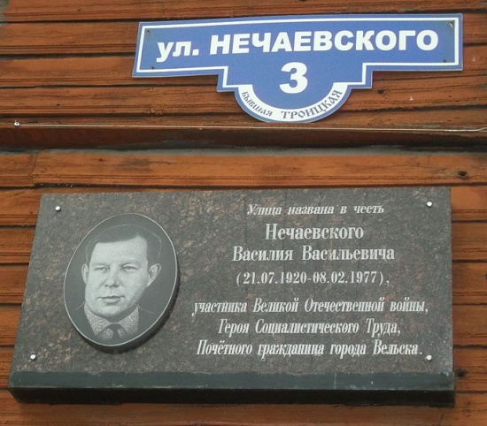 Одной из улиц в центральной части Вельска, на которой он жил (улице Свободы), в июле 1977 года было присвоено его имя. 21 июля 2010 года на доме № 3 по улице Нечаевского была открыта мемориальная доска.