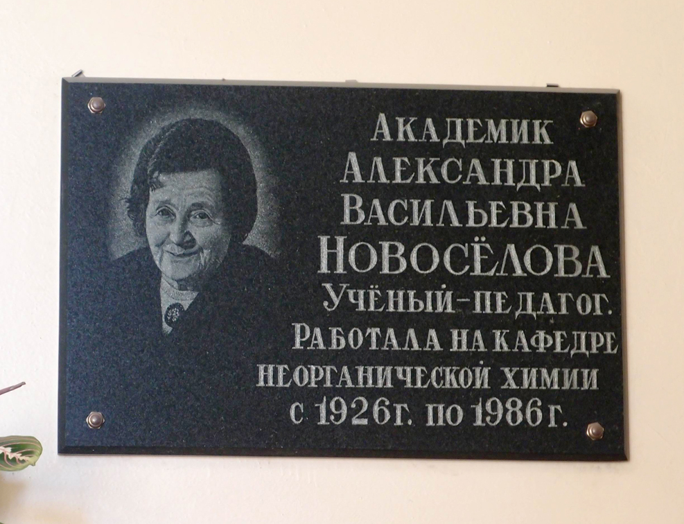 В здании химического факультета Московского государственного университета, где работала А.В.Новосёлова, установлена мемориальная доска.
