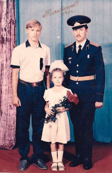 В.И. Очеретный при выпуске из военного училища, с братом и сестрой. Фото 1991 года. Фотография предоставлена сотрудниками Курганинского исторического музея Краснодарского края.