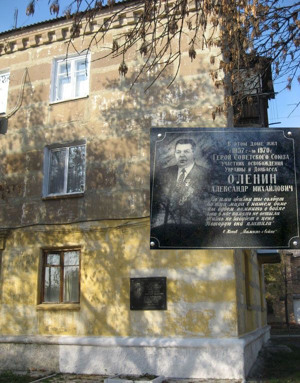 В городе Ждановка на доме, в котором жил А.М. Оленин, установлена мемориальная доска. В городе Горловке Донецкой области Украины в сквере Юных коммунаров на мемориальной плите высечено имя Героя Советского Союза А.М. Оленина.