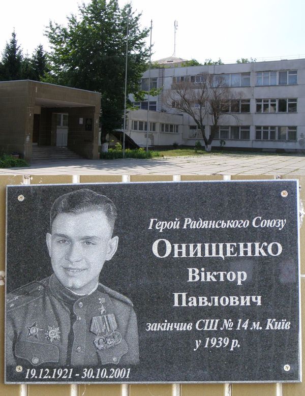 В Киеве на здании школы, в которой учился В.П.Онищенко, установлена мемориальная доска.