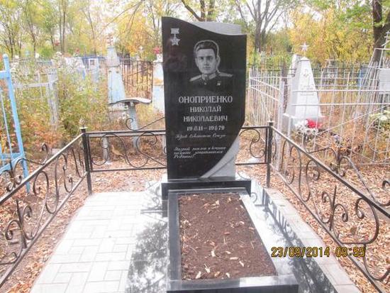 За образцовое выполнение боевых заданий командования на фронте борьбы с немецко-фашистскими захватчиками и проявленные при этом отвагу и геройство указом Президиума Верховного Совета от 29 июня 1945 года гвардии полковнику Оноприенко Николаю Николаевичу присвоено звание Героя Советского Союза с вручением ордена Ленина и медали "Золотая Звезда".