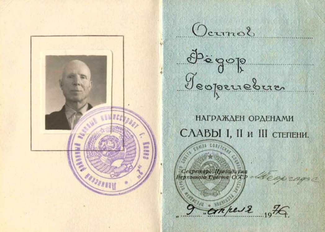 Приказом по 301-й стрелковой дивизии №038/н от 4 сентября 1944 года за образцовое выполнение заданий командования в боях с немецко-фашистскими захватчиками красноармеец Осипов Фёдор Георгиевич награждён орденом Славы 3-й степени (№ 71109).