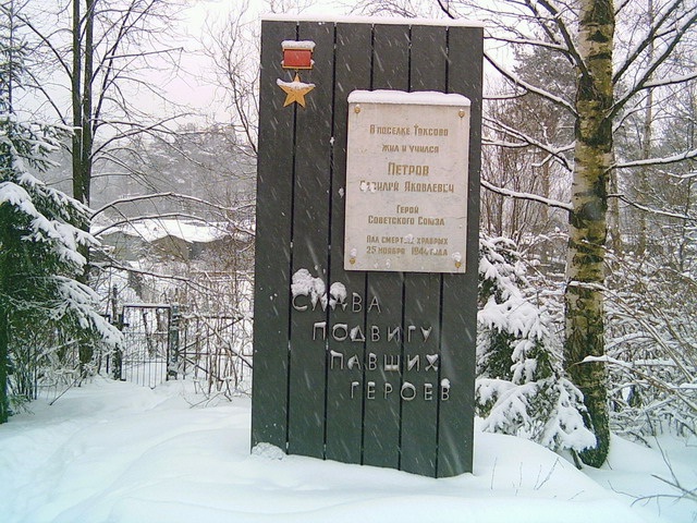 Герой Советского Союза командир взвода 47-й отдельной разведывательной роты 48-й гвардейской стрелковой дивизии гвардии младший лейтенант В.Я.Петров был убит при выполнении боевого задания 25 ноября 1944 года на территории Восточной Пруссии в 10 км юго-восточнее города Гумбиннен (ныне город Гусев Калининградской области). По некоторым данным, погиб, прикрывая отход своей группы, обнаруженной противником.