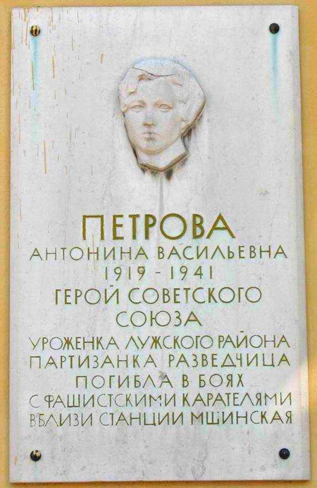 4 ноября 1941 года в 10 километрах к юго-западу от посёлка Мшинская Лужского района партизанский лагерь, в котором в это время находилось несколько бойцов, был окружён крупным отрядом карателей. Комсомолка Антонина Петрова первой вступила в бой и сражалась до последнего патрона. Похоронена в городе Луга Ленинградской области, где на её могиле установлен обелиск.