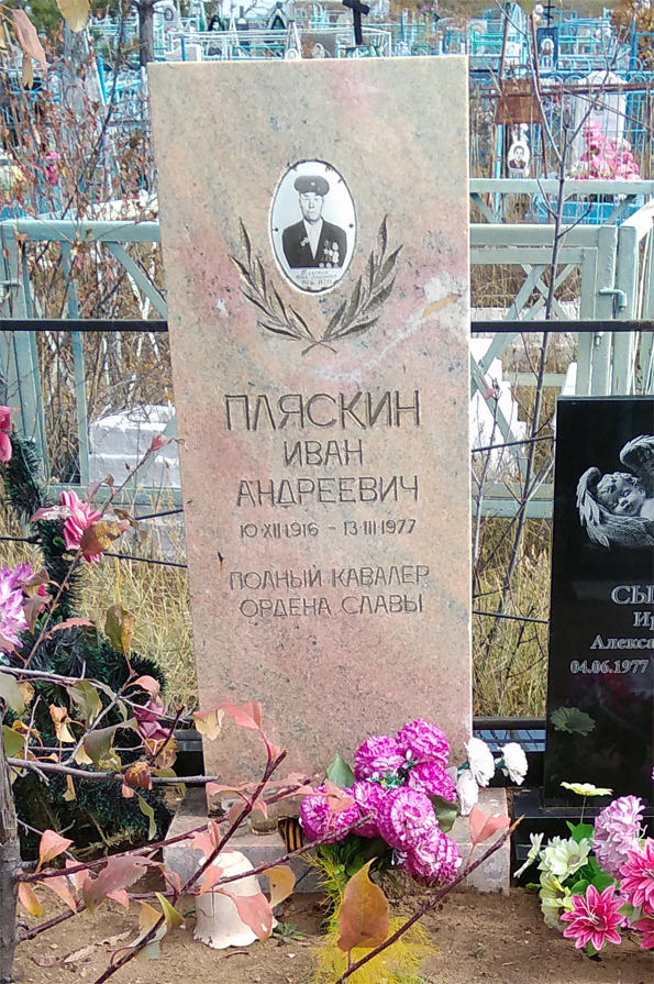 Пляскин Иван Андреевич – командир орудия батареи 45-миллиметровых пушек 5-го гвардейского Мукачевского ордена Кутузова воздушно-десантного стрелкового полка (2-я гвардейская Проскуровская ордена Суворова воздушно-десантная дивизия, 95-й стрелковый корпус, 1-я гвардейская армия, 4-й Украинский фронт), гвардии сержант – на момент последнего представления к награждению орденом Славы.