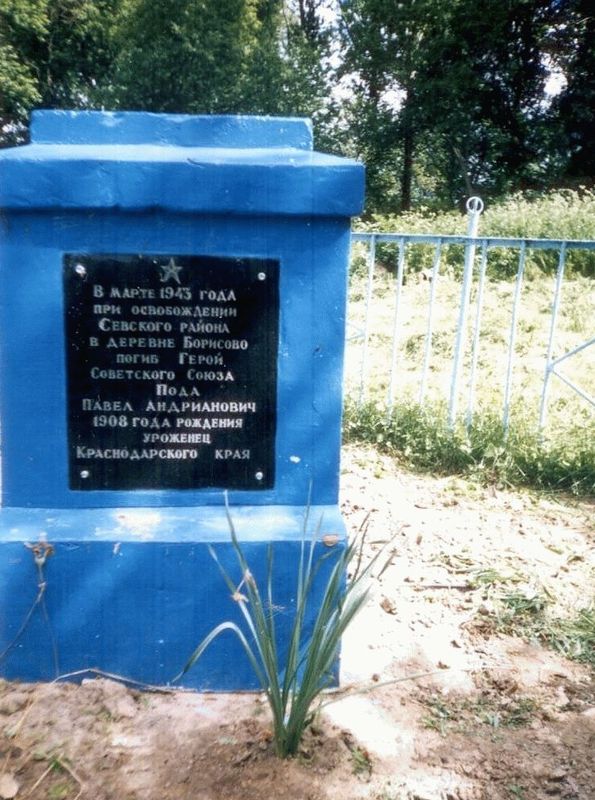 18 марта 1943 года в бою у деревни Борисово Севского района Брянской области пулемётный взвод лейтенанта П.А. Поды прикрывал отход 11-го гвардейского кавалерийского полка. Когда пехота и танки противника обошли фланги и ворвались в деревню, пулемётные расчёты были выведены из строя.