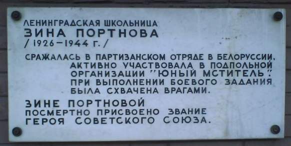 Портнова Зинаида Мартыновна (Зина Портнова) - юная партизанка - член подпольной комсомсомольско-молодёжной организации "Юные мстители"; разведчица партизанского отряда имени К.Е. Ворошилова на временно оккупированной территории Белорусской ССР.