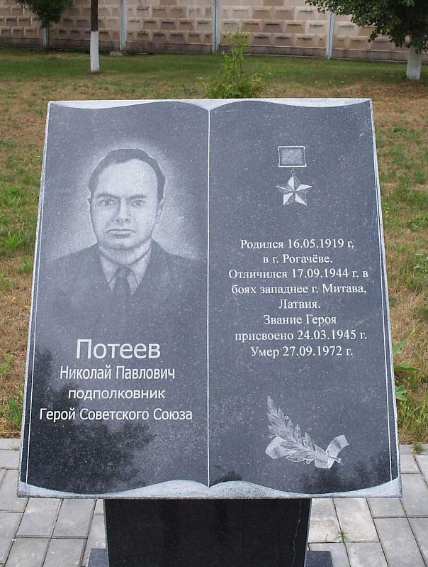 В городе Рогачёв Гомельской области на Аллее Героев в Пионерском парке установлен памятный знак Н.П.Потееву.