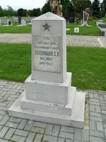 С 1946 года подполковник С.П.Поздняков - в запасе. Жил и работал в городе Брест (Белоруссия). Погиб в результате несчастного случая 30 сентября 1949 года. Похоронен на Гарнизонном кладбище в Бресте.