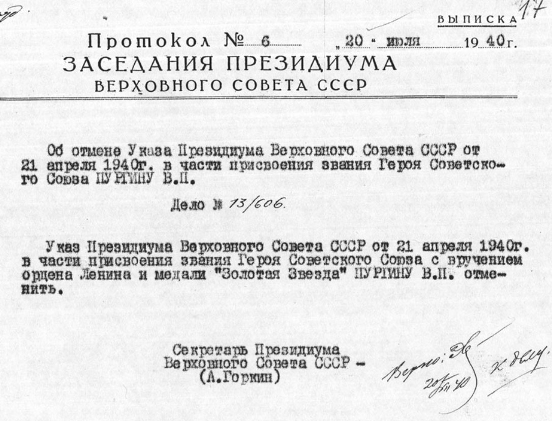 Указом Президиума Верховного Совета СССР от 20 июля 1940 года по представлению суда был отменён Указ Президиума Верховного Совета СССР от 21 апреля 1940 в части присвоения звания Героя Советского Союза В.П. Пургину.