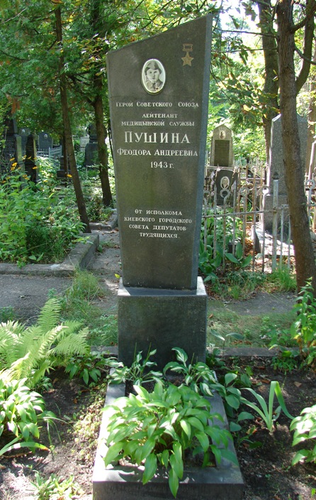 Пушина Федора (Феодора) Андреевна - военфельдшер 520-го стрелкового полка 167-й стрелковой дивизии 38-й армии 1-го Украинского фронта, лейтенант медицинской службы.
