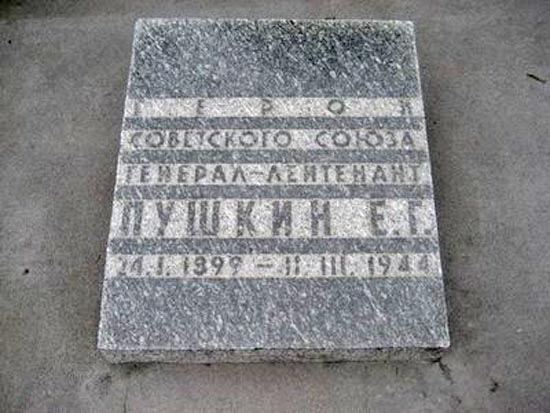 Командир 23-го танкового корпуса генерал-лейтенант танковых войск Е.Г.Пушкин погиб 11 марта 1944 года у села Новоивановка Баштанского района Николаевской области Украины: находясь в передовых частях корпуса, прорвавшего вражескую оборону и стремительно наступавшего по тылам врага, он погиб при налёте немецкой авиации. Похоронен в городе Днепропетровске на Мемориальном комплексе.