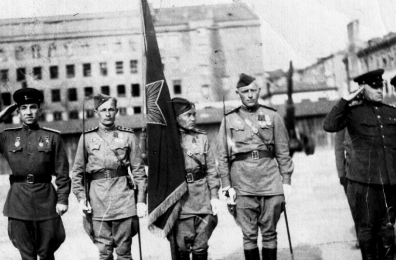 Разворачиваю второй немецкий пулемет, но по траншее бежит немецкая подмога. Я беру ихние гранаты – хлопушки с деревянной ручкой и уничтожаю 3 – 4 человека. Развернув пулемет, прострочил по отдельному домику (там был населенный пункт Смолы, когда-то на У-2 привозили туда почту, а немец там сосредоточил потом свой аэродром). По ходу сообщения пробираюсь к домику, бросаю 2 гранаты и забираю там трех пленных. К этому времени 196-й полк переправился на левый берег. С пленными возвращаюсь на правый берег, на НП командира нашего полка. Там собрались командир дивизии генерал-майор Баксов, командующий армией генерал-полковник Чистяков, командующий 1-м Прибалтийским фронтом Баграмян.