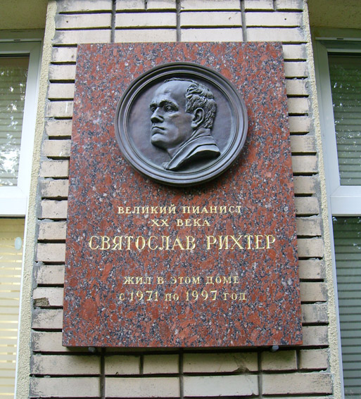 Установлена в Москве (улица Большая Бронная, дом 2/6) на доме, в котором в 1971-1997 годах жил С.Т.Рихтер. Скульптор А.Н.Бурганов. Открыта 21 марта 2005 года. Фото А.А.Симонова, 24.07.2009.