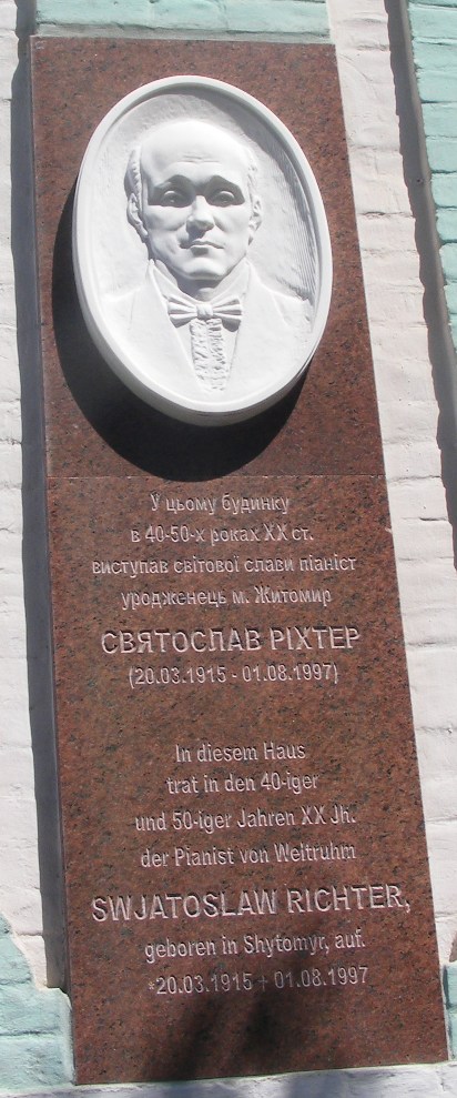 Установлена на здании детской музыкальной школы №2 (ул. 1 Мая, 27), в помещении которой Святослав Рихтер неоднократно выступал в 40-50-е годы ХХ века.Фото А.Наровлянского, 26.07.2012.