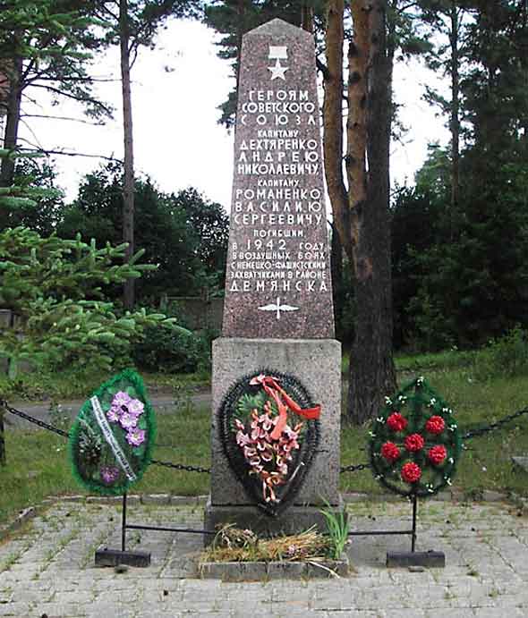 В мае 1967 года, у дороги на въезде в посёлок Демянск установлен обелиск лётчикам Героям Советского Союза капитанам Романенко Василию Сергеевичу и Дехтяренко Андрею Николаевичу погибшим в 1942 году. В честь героев в Демянске названы улицы.