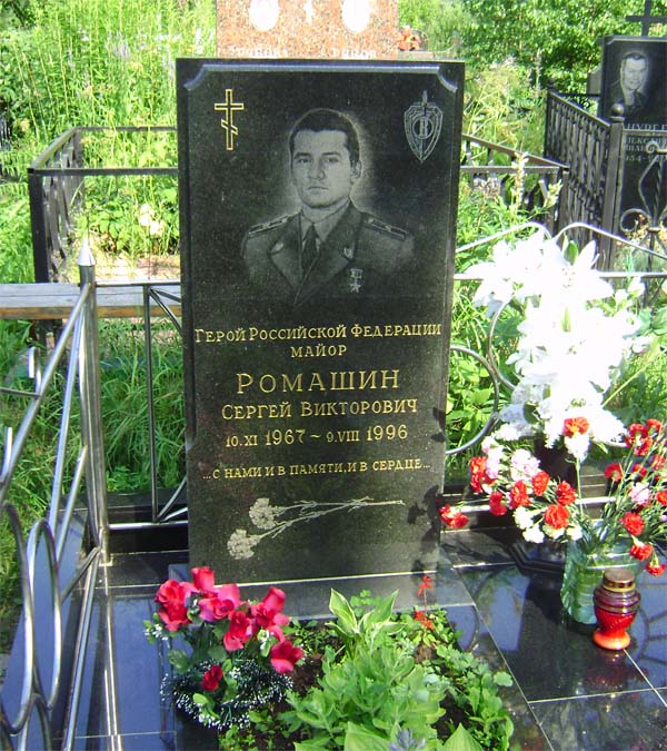 Трое суток сотрудники ФСБ вели неравный бой. Когда большая часть оборонявшихся получили ранения, на исходе оказались боеприпасы, кончилась вода, было решено идти на прорыв. Разделились на три группы. Первая успешно прорвалась к своим, но вторая попала в засаду. Эту группу возглавлял Сергей Ромашин. Когда в упор по бойцам стали бить пулеметы, он получил несколько ранений, но нашел в себе силы открыть ответный огонь. Он принял свой последний бой, прикрывая шедших впереди товарищей и добился своего - они прорвались. Самому Ромашину, получившему сразу несколько ранений, прорваться было не суждено. Он сумел пробиться к подвалу одного из домов. Сначала вел огонь из автомата, уничтожив расстреливавшего группу пулеметчика. Потом в ход пошли гранаты. Когда наступила тишина и боевики рискнули приблизиться к подвалу, несколько пистолетных выстрелов сразили ближайших врагов. А потом сухо треснул последний выстрел... Майор Федеральной службы безопасности России Сергей Ромашин не сдался врагу, предпочтя смерть плену.