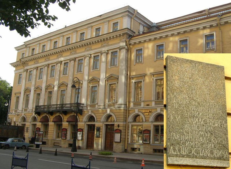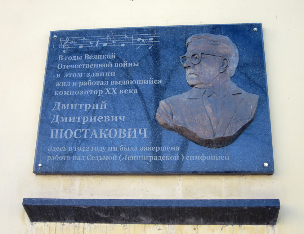 Установлена в 1985 году на здании большого концертного зала Санкт-Петербургской консерватории (улица Михайловская, 2), где 9 августа 1942 года была исполнена 7-я (Ленинградская) симфония Д.Д.Шостаковича. Архитектор В.В.Исаева. Фото Олега Кожухаря, 09.08.2012.
