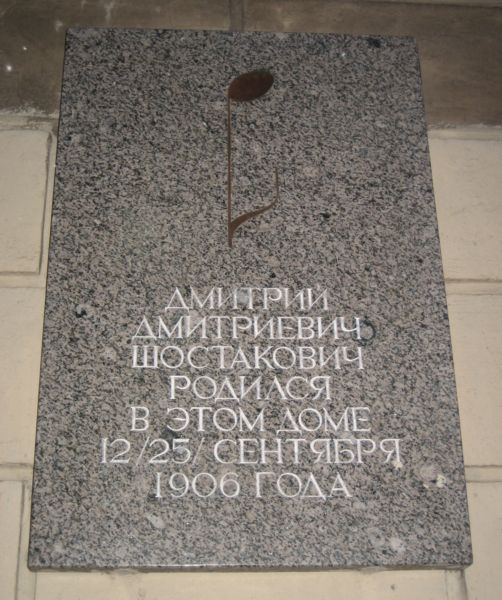 Мемориальная доска в Санкт-Петербурге на доме, где 12 (25) сентября 1906 года родился Д.Д.Шостакович (улица Подольская, 2). Открыта в 1996 году. Архитектор Г.А.Григорьев. Фото А.В.Пиголицына (Санкт-Петербург), 2011.