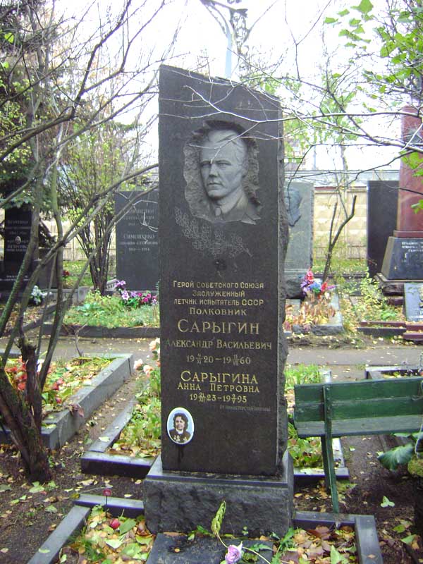 Герой Советского Союза, Заслуженный летчик-испытатель CCCР, полковник А.В. Сарыгин скончался 11 июля 1960 года. Похоронен в Москве на Новодевичьем кладбище (участок 8).