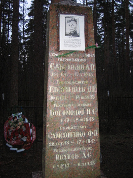 Похоронен в городе-герое Ленинграде - Санкт-Петрербурге на воинском кладбище Сосновского лесопарка (место № 32), расположенного в Выборгском районе между проспектами Светлановским, Тореза, Северным и Тихорецким, где в годы Великой Отечественной войны располагался полевой аэродром «Сосновка».