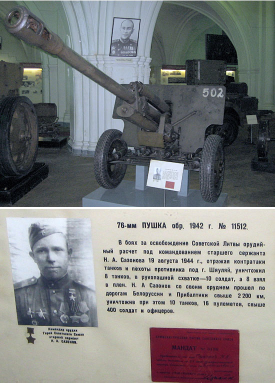Пушка стояла перпендикулярно шоссе и била вражеские танки в борта. В считанные минуты все 7 танков были подбиты. Некоторые из них успели произвести по 2-3 прицельных выстрела, снаряды рвались возле пушки, но она продолжала вести огонь. Когда последний танк застыл на шоссе, над щитом противотанкового орудия показалась голова в пилотке. Боец выпрямился и, положив руку на щит, долго смотрел на горящие бронированные махины. Это был командир орудия старший сержант Сазонов. Фашисты не прошли в Шауляй.