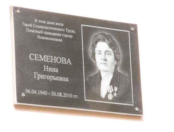 20 августа 2013 года в Новомосковске, на доме где жила Н.Г. Семёнова ей была установлена мемориальная доска.