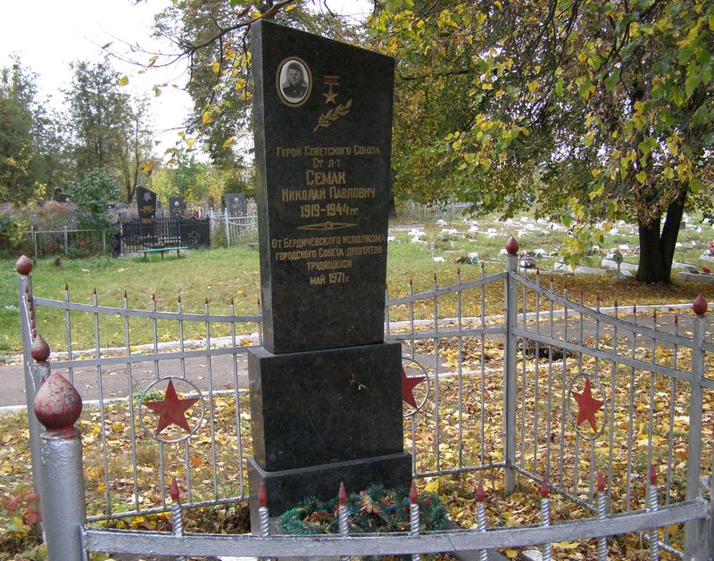Н.П. Семак выбирал маршрут между пнями давно срубленного тут леса. Прикидывал расстояние и внимательно выбирал место, откуда наверняка можно будет поразить танк. И вот они сблизились. Гвардии лейтенант сильно бросил одну гранату. Она взорвалась на башне танка. Но махина продолжала двигаться. Тогда Н.П. Семак выполз наперерез "тигру" и сунул вторую гранату под его гусеницу. Раздался взрыв. Николай Павлович Семак погиб. Похоронен в городе Бердичеве на воинском участке старого городского кладбища.