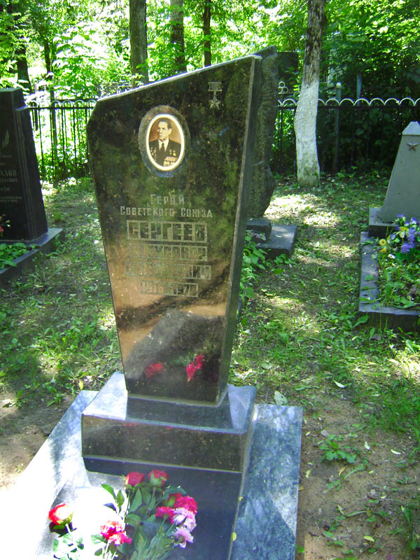 Командир эскадрона гвардии капитан Сергеев отличился в бою за город Фюрстенвальде (юго-восточнее Берлина). 23 апреля 1945 года с эскадроном он форсировал реку Шпре, Шпре-канал и захватил плацдарм, чем обеспечил выход остальных подразделений своей дивизии на автомагистраль Франкфурт-Берлин. Сергеев отразил 8 контратак гитлеровцев, захватил 5 складов с боеприпасами и военным имуществом.