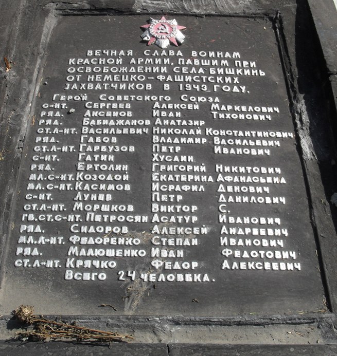 А.М.Сергеев похоронен в братской могиле в центре села Бишкинь, где установлен памятник 24 советским воинам, погибшим в боях за это село.