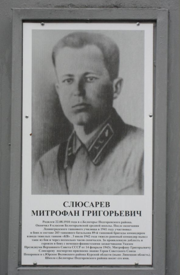 Лейтенант тов. Слюсарев Митрофан Григорьевич в районе деревни Мишино Курской области лично участвовал в 3-х атаках и уничтожил до эскадрона кавалерии, 4 пушки, 2 миномета. Во время 3-й атаки 3 июля 1942 года его танк был подбит, все в экипаже были убиты: тов. Слюсареву в танке оторвало правую ногу и перебило руку. Выполняя до конца свой долг перед Родиной, проявляя героизм и отвагу, собрав последние силы тов. Слюсарев, оставшись один в танке «КВ», вывел его с поля боя и после 10 часов от тяжёлого ранения и истечения крови умер.