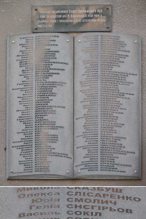 Установлена в на фасаде дома «Слово» - жилого дом по улице Культуры, 9. Таблица с очень неполным списком живших и работавших здесь писателей появилась в конце 80-х на гребне «перестройки». Десять лет спустя сорвана и разбита неизвестными лицами. Памятный знак, дополненный новыми именами, был установлен без официального открытия ко Дню Независимости в августе 2003 года. В настоящее время заменён ещё более полным: Информация и фото с сайта http://ru.wikipedia.org/wiki/Дом_«Слово»